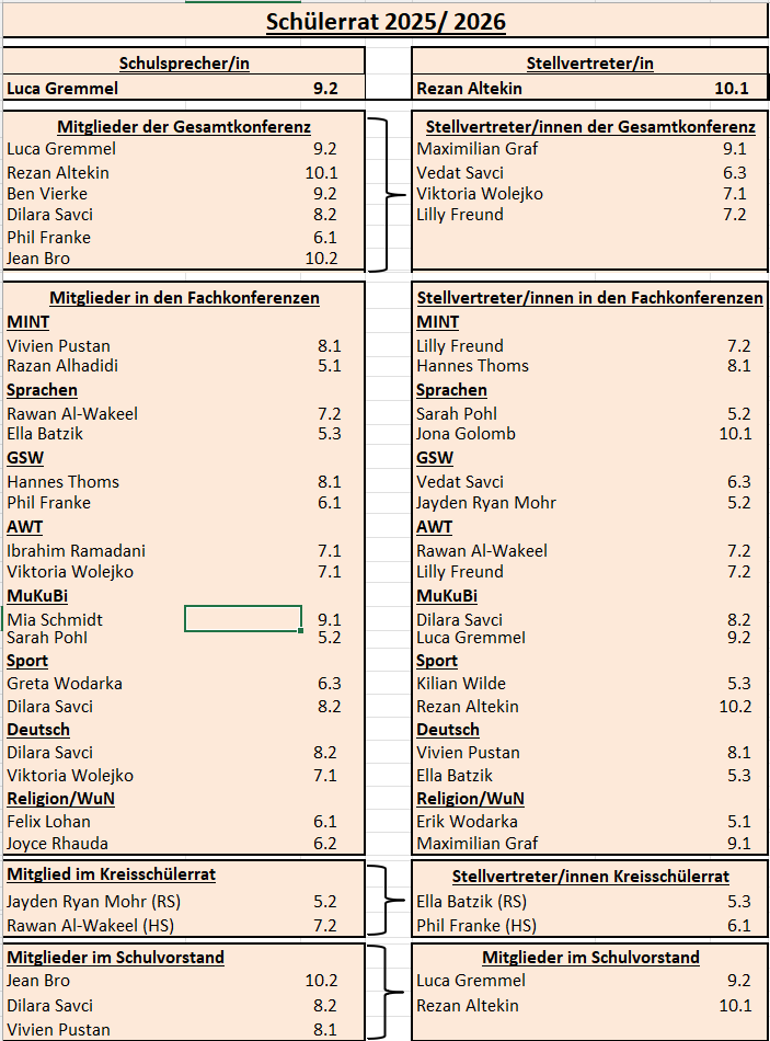Die Schülervertretung vertritt die Interessen der Schülerinnen und Schüler gegenüber der Schule. Gemeinsam mit der Schulleitung und dem Elternbeirat organisiert sie größere Veranstaltungen (z. B. Sommerfest). Durch kleinere Aktionen und Veranstaltungen setzt die Schülervertretung außerdem selbst Akzente. Für Fragen und Anregungen von Schülerinnen und Schülern haben die Mitglieder der Schülervertretung stets ein offenes Ohr. Die Mitglieder werden vom Klassenrat, der aus allen Klassensprechern und ihren Stellvertretern besteht, gewählt. Unsere Schülervertretung besteht im Moment aus folgenden Schülern:
