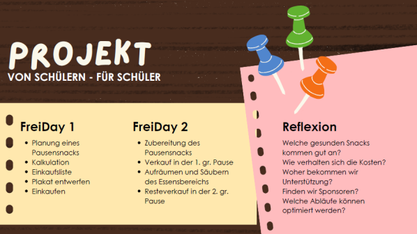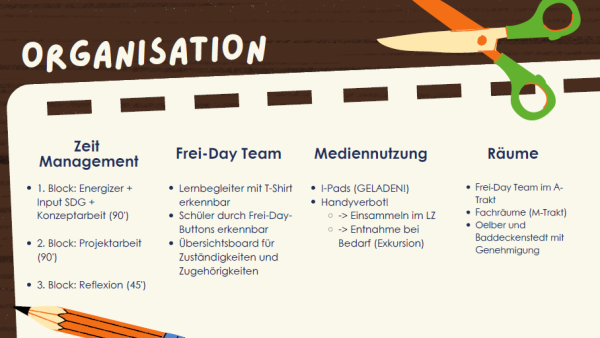 Der Frei-Day ist ein besonderer Schultag, der im Zuge der Agenda 2030 ins Leben gerufen wurde. An diesem Tag haben die Schülerinnen und Schüler die Möglichkeit, in kleinen Gruppen selbstständig zu agieren und sich frei zu bewegen. Die Schüler planen ihre eigenen Projekte und führen diese durch, sei es im Freien, in der Schule oder in der näheren Umgebung. Das Projekt muss lediglich unter der Überschrift Nachhaltigkeit, Verbesserung des Schullebens (Wohle School Approach) oder des Gemeindewohls stehen. Der Frei-Day fördert die Selbstständigkeit, Teamarbeit und Kreativität der Schülerinnen und Schüler und bietet ihnen die Chance, soziale Kompetenzen zu entwickeln und Verantwortung zu übernehmen. Die Rahmenbedingungen für den Frei-Day schafft jede Schule selbst. Unser Konzept sieht wie folgt aus: