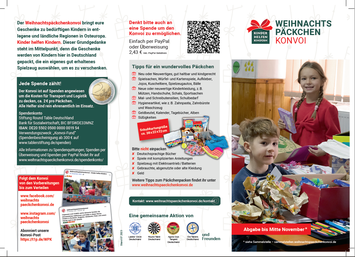 Plakate und Flyer dazu hängen auch nochmal in der Schule aus. Nähere Informationen auch unter: https://weihnachtspaeckchenkonvoi.de/