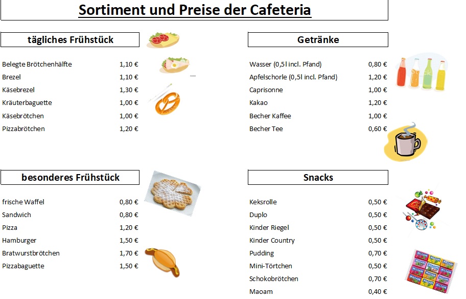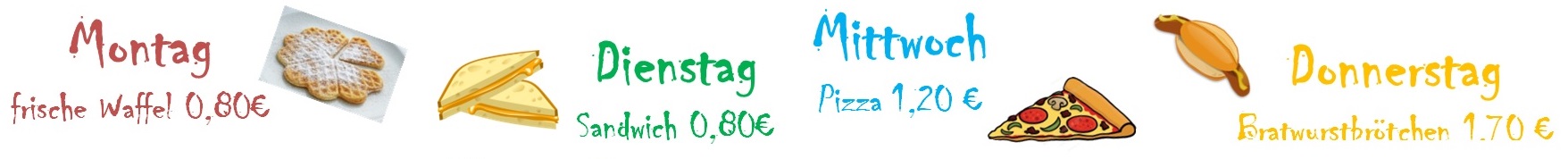Die Cafeteria bietet allen Schülerinnen und Schüler in der 1. und 2. großen Pause vielfältige Snacks und Getränke zum Kauf an. An unseren Thementagen können Schüler und Schülerinnen auf folgende Snacks freuen: