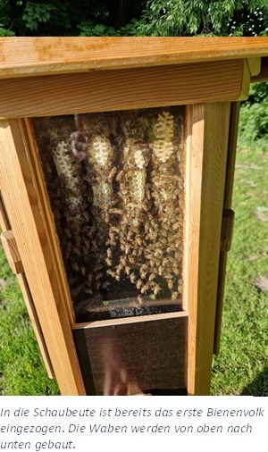 Diese wird von einem Tischlermeister eigens handgefertigt und ist so konzipiert, dass die Außenhülle aus Plexiglas gestaltet ist. Die Bienen können somit ungestört ihrem täglichen Treiben nachgehen. Die Schülerinnen und Schüler haben die Möglichkeit dieses gefahrlos zu beobachten und das Bienenwesen dabei zu erforschen.